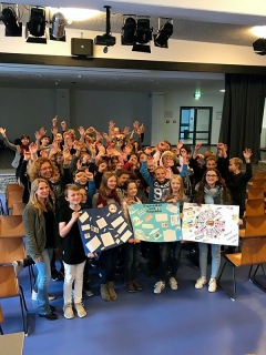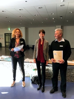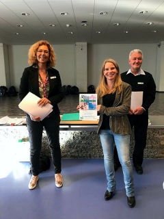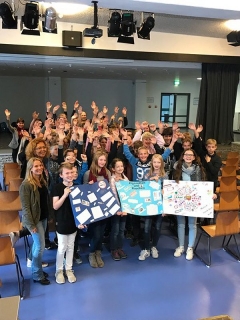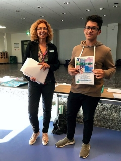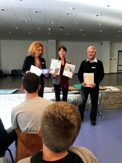 Nun zählen alle vier Kurse, die mittlerweile in der Jahrgangsstufe 8 sind, zu den Preisträgern! Aus diesem Grund wird die Siegerehrung direkt bei uns im Hause durchgeführt. Die Kurse von Herrn Plasberg, Frau Danzberger und Frau Holstein haben jeweils 125,- Euro gewonnen, der Kurs von Frau Brieden wird einen Tag auf der Wasserskianlage Langenfeld verbringen. Frau Lenz von der AOK hat die Preisverleihung übernommen und sich begeistert von Qualität und Quantität der Schülerprodukte gezeigt.