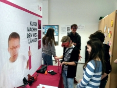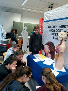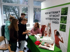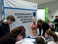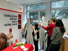 An der ersten Station wurden uns verschiedene Gesetze rund um das Thema Alkohol erklärt. Von dort ging es zu Station zwei, wo wir Argumente für und gegen das Trinken von Alkohol gegeneinander abwogen. Wir fanden mehr Argumente, die dagegensprechen, Alkohol zu trinken. Um die gesundheitlichen Folgen ging es an Station drei. Wir waren verwundert darüber, wie viele Organe vom Alkohol geschädigt werden. Bei Station vier ging es um das Verhalten, wenn man alkoholisiert ist. Auf abwischbare Figuren schrieben die Schülerinnen und die Schüler getrennt von einander auf, welches Verhalten sie an dem anderen Geschlecht mögen und welches Verhalten sie nicht mögen. Um die Rauschsituation auch ohne Alkohol zu erleben, gab es an der fünften Station sogenannte Rauschbrillen. Dort konnten wir mit verschiedenen Übungen testen, ob man alkoholisiert noch im Alltag klarkommen würde.
