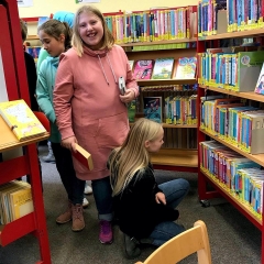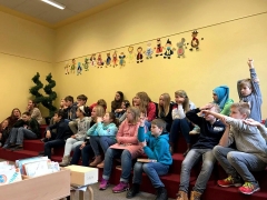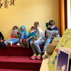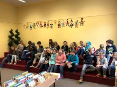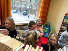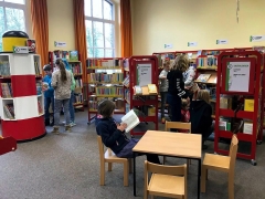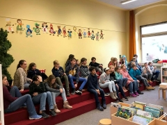 Bücher-Casting beim Besuch der Klasse 6b in der Stadtteilbibliothek Langenberg