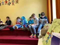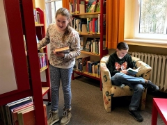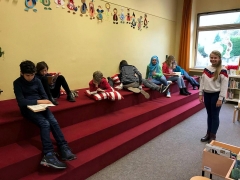 Als Teil des Konzeptes zur Leseförderung besuchen die 5. und 6. Klassen einmal im Schuljahr die Stadtteilbibliothek Langenberg. Passend zu dem im Unterricht durchgeführten Vorlesewettbewerb und dem Unterrichtsvorhaben „Präsentation des Lieblingsbuches“ hatte die Bibliothekarin Frau Waßerloos ein interessantes Casting vorbereitet. Aber zuerst hatten die Jungen und Mädchen Zeit sich umzusehen, ihre Lieblingsbücher zu suchen oder neues Lesefutter zu finden.
