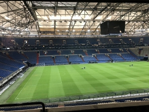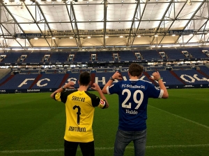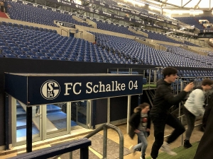 Nach fast 1,5 stündiger Diskussion stärkten sich die Schülerinnen und Schüler mit einer Pommes Currywurst, bevor es in kleinen Gruppen zur Stadionführung ging. Mit einem herzlichen „Glück Auf!“ begrüßten uns die teilweise ehrenamtlichen Führer. Es folgten viele technische und wirtschaftliche Informationen zur Arena und am Ende landeten wir im Herzstück – der Kabine. Von dort aus ging es für uns durch den Tunnel auf den Platz – spätestens das ließ die Blau-Weißen Herzen höher schlagen.
