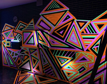 Denn bereits an der Tür überraschte die Besucher ein musikalischer Empfang mit Geigen, Cello, Klavier, Xylophon und Klarinette dirigiert von Musiklehrerin Krisztina Sonder, um den Besucher mit dem eigens für die Ausstellung komponierten Stück „Space Neon (Dis)harmony“ auf die Ausstellung vorzubereiten und die Neontapewand, ein Kunstwerk der Q1 von Kunstlehrerin Laura Grönig, mit passenden Klängen zu illustrieren.