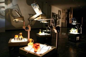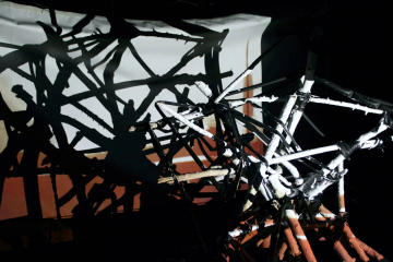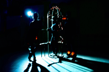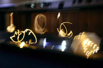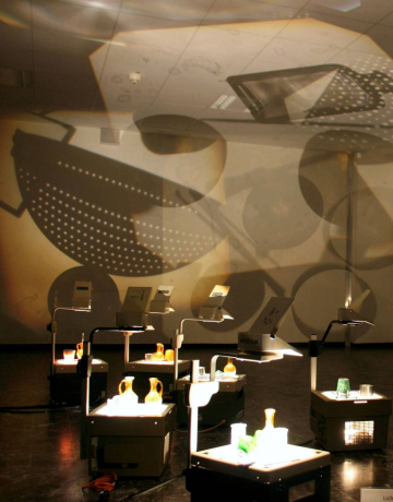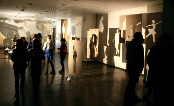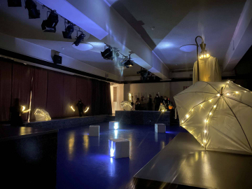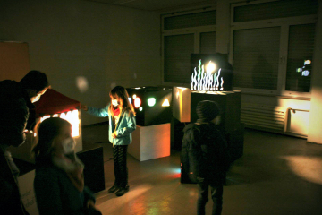 Weiter führte einen der Gang zu einer tänzerischen Darbietung der Schülerinnen der Tanzwerkstatt, geleitet von Nicole Siefert, in völliger Dunkelheit, wo sich nur erahnen ließ, dass die leuchtenden Regenschirme und Kugeln von Tänzerinnen zur Musik bewegt wurden. Alsdann führte einen der Weg zu klar konturierten Schatten beleuchteter Schablonen von Menschen in all ihren Facetten, dick, dünn, schwanger, wandernd oder tanzend, gefolgt von Schatten von Stillleben, deren Gegenstände auf Overheadprojektoren drapiert sich überlappend surreale Schattenbilder an die Wand warfen.