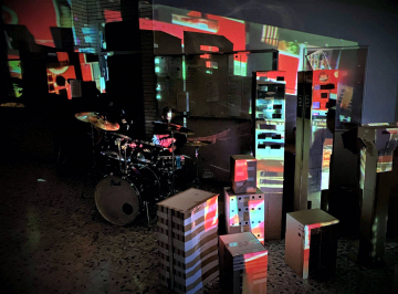 Betrat man nun den Flur, zogen die rockigen Klänge des Schlagzeugs und der E-Gitarre den Besucher magisch an, und man gesellte sich zu der bereits dort stehenden Menge, um sich dem so lange vermissten Festival- und Rockkonzertfeeling ein wenig hinzugeben und mit den bekannten Klängen mitzuwippen. Erst dann fiel der Blick auf die Großstadtkulisse, die die Musik begleitete, eine Installation der Q1, die Skyline of Products, die mit ihrer Werbekulisse an Großstädte wie Tokyo erinnerte.