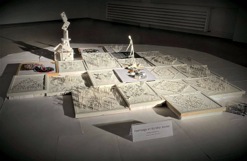 Wieder im Gebäude führte der Weg vorbei an Bildern der EF mit Farbspielen zu einem Kunstwerk, das auf die Plastikverschmutzung der Meere hinwies und dann zu einem Raum, der eine Hommage an Günther Uecker beherbergte und von dem Kunstkurs der EF hergestellt worden war, eine aus mehreren Elementen bestehende Skulptur am Boden, die vor allem aus Nägeln, Zahnstochern und Verpackungsmaterialien gestaltet war und durch die Beleuchtung interessante Schatten warf. Kunstlehrerin und Kunsthistorikerin Anne-Marie Keller brachte dem Besucher den Künstler Günther Uecker in ihrer lebhaften Art nahe, erzählte von seinem Spaziergang durch das zerbombte Berlin 1945 und wie er die Nägel und anderen zerbombten Kleinteile nutzte, um Kunst zu schaffen, die Schattenbilder erzeugt, in einer Zeit, wo keine Farbe vorhanden war und deswegen mit dem Schatten als Stilmittel zu arbeiten. Ein weiterer Raum zeigte Würfelboxen mit Stillleben, ein Kunstprojekt der Q1, das von Violinistinnen des Schulorchesters illustriert wurde.