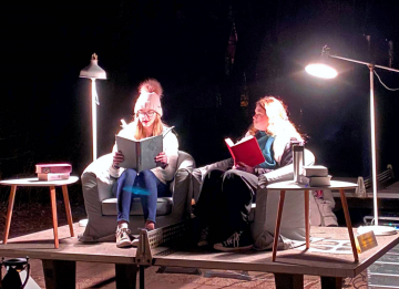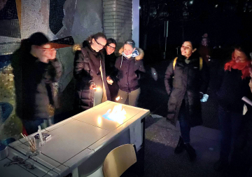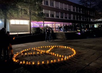 Wieder führte einen der Weg nach draußen, diesmal auf den dunklen Schulhof, der ebenfalls Schauplatz gleich mehrerer Darbietungen war. Schülerinnen lasen Gedichte und Geschichten auf Podesten in Ohrenbackensesseln unterm Lampenschirm, denen man lauschen konnte, Schüler der Chemie aus Klasse 8 und 9 präsentierten unter Aufsicht und Anleitung von Kerstin Spiecker, wie farbenfroh Eisenwolle und andere Chemikalien im Bunsenbrenner leuchten und Tänzerinnen und Tänzer der Tanzwerkstatt von Nicole Siefert und die Kulturentdecker der Klassen 5, die mit Knicklichtern ausgestattet sich zu Wald- und Wasserklängen bewegten und von denen sonst nur noch die Turnschuhe leuchteten, bannten die Blicke der Besucher mit Radschlägen und weiteren Tanzbewegungen. Viele Besucher machten Bilder von dem überdimensionalen Friedenszeichen auf dem Schulhof, das aus Teelichtern gestellt ein stimmungsvolles Bild gab und Hoffnung verbreitete.