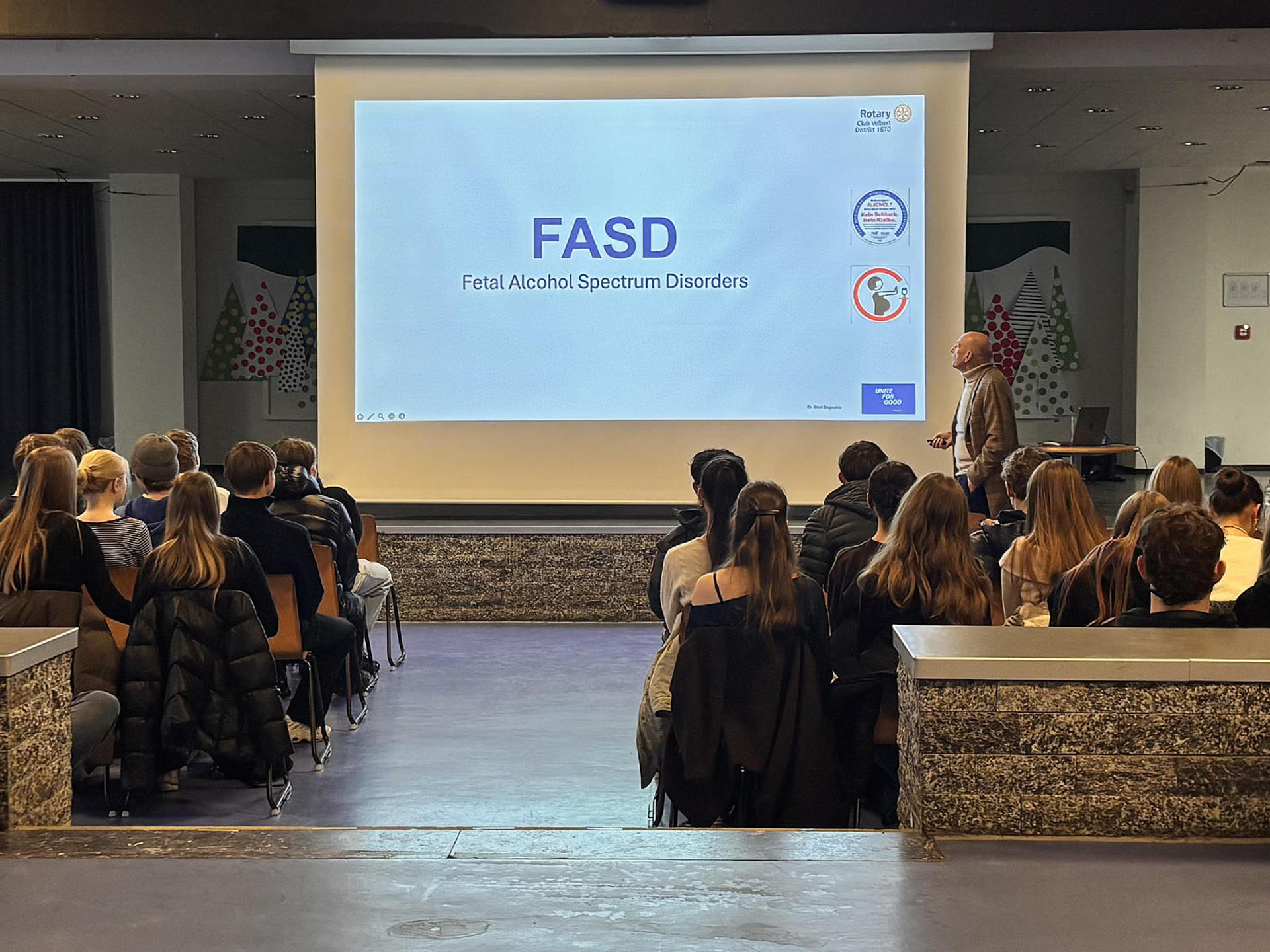 Die Aufklärung zum Thema FASD ist ein Schwerpunkt des Rotary Clubs Velbert und anderer Rotary Clubs in Deutschland. Aus diesem Grund haben Dr. Degoutrie und sein Kollege Dr. Ehmann diesen Vortrag ausgearbeitet und stellen sich Schulen in Velbert und Heiligenhaus unentgeltlich zur Verfügung.