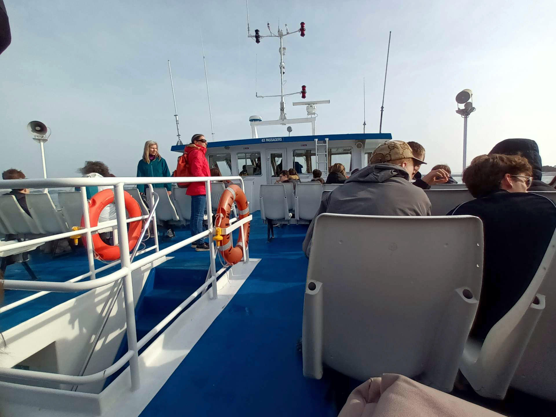 Zusammen mit unseren Austauschschüler(inne)n fuhren wir mit einem Boot um die gesamte Insel und besichtigten die Strände und Ufer. Als wir auf der Insel ankamen, suchten wir anhand von Fotos verschiedene Orte und erkundeten so den südlichen Teil der Insel. Nach dem gemeinsamen Picknick machten wir uns auf den Rückweg.