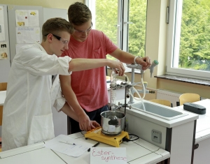 In kontinuierlicher Fortführung der Arbeit der Mittelstufe erfolgt in den Jahrgangsstufen EF, Q1 und Q2 eine solide, konsequente wissenschaftspropädeutische Behandlung der Fachthemen. Unter den Chemielehrern besteht ein unbedingter Konsens darüber, worin der gymnasiale Aspekt dieser Vorgehensweise liegt: Erlangung von Kenntnissen über Stoffe und Herleitung von Gesetzmäßigkeiten ausgehend von Experimenten; Erstellung von Hypothesen; Bearbeitung und Strukturierung des Wissens mit Hilfe von Fachbegriffen, Theorien und Modellen; Einordnen von Zusammenhängen in dieses Begriffsgebilde und die Modellvorstellungen; Beschreibung von fachspezifischen Sachverhalten mit Hilfe der Fachsprache und Fachsymbolik; Auswertung quantitativer Experimente durch exakte auch mathematische Bearbeitung der Versuchsergebnisse, vor allem im Teilgebiet physikalische Chemie. Die einzelnen Teilthemen sind hier nur insofern von Belang, als sie in diesem allgemeinen Anspruch Relevanz besitzen. Unterstützt wird diese Arbeit durch die originale Begegnung mit der Berufswelt in der chemischen Industrie